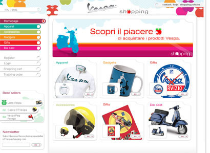 Cada vez esta mas de moda la imagen de Vespa, la retro y la moderna, y como en Piaggio no son tontas no piensan dejar pasar la oportunidad de hacer negocio. Para eso han montado esta web Vespashopping.com, donde podrás hacerte con cascos, chaquetas, tazas y bastantes cacharros de la memorabilia de la marca italiana de scooter.