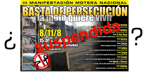 Al parecer la información mostrada ayer en Motociclismo.es sobre la anulación de la Manifestación Nacional Motera convocada para el próximo sábado no era del todo cierta. Según podemos leer en la web de la organización, "estámos a la espera de la respuesta, autorización o denegación, de la misma". Además recalcan que "La organización no ha desconvocado la Manifestación de los moteros el 8N8".