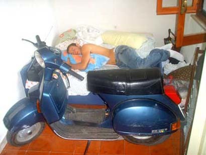 Para empezar el tema, aquí tenéis esta en la que este pobre chaval, impulsado por no se que extraña circunstancia, ha metido la Vespa en la misma habitación en la que duerme. Me puedo imaginar alguna, incluso la de que no haya sido él, si no sus amigos los que le han aparcado la moto cerca para evitar males mayores, quien sabe.