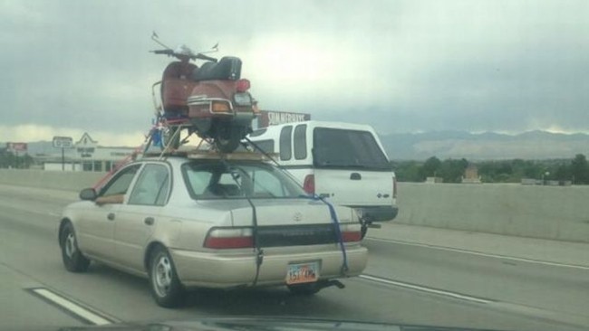 Si tienes que transportar tu moto existen muchas posibilidades para hacerlo. Desde llevarla en un camión, camioneta, furgoneta o remolque. Por poner unos cuantos ejemplos fáciles que me vienen a la cabeza. Pero si lo tuyo es estrujarte la cabeza (y vives en USA) puedes ir un paso más allá de lo que va el resto de la humanidad y puedes probar lo que ves en la foto que encabeza esta entrada.
