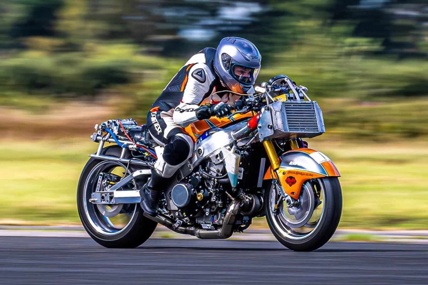 Y uno una moto cualquiera. En realidad es una Suzuki Hayabusa que más bien parece una bestia desnuda. Turboalimentada y con más de 350 CV bajo el asiento, le ha valido para llegar a los casi 400 kilómetros por hora.