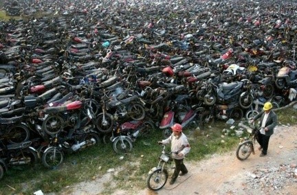 En Asia la producción de motos de pequeña cilindrada llega a varios millones al año, pero lo que nunca se me había ocurrido pensar es la cantidad de deshechos que genera este inmenso parque de vehículos cuando se accidentan y ya no pueden seguir circulando. Lógicamente el negocio de los recambios es muy interesante para cualquier empresa, pero viendo estas fotos, parece que los usuarios lo tienen aun más claro, porque en un sitio así puedes encontrar casi de todo para reconstruirte la moto con un poco de paciencia y maña.