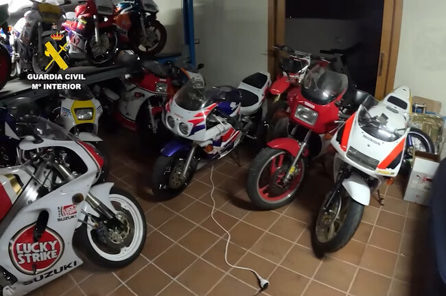 Honda CBR, NSR, Yamaha, Suzuki, Aprilia dos tiempos... Y todas apiladas en aparente buen estado. El alijo económico y material ha sido importante; pero lo que se han encontrado los agentes ahí dentro es todo un museo de la moto. Y puede que salgan a subasta.