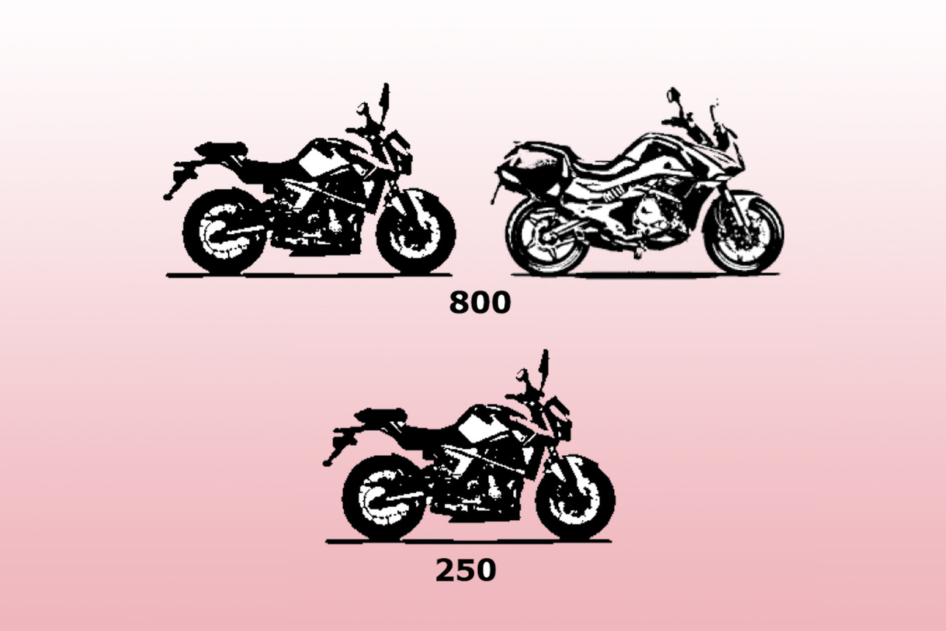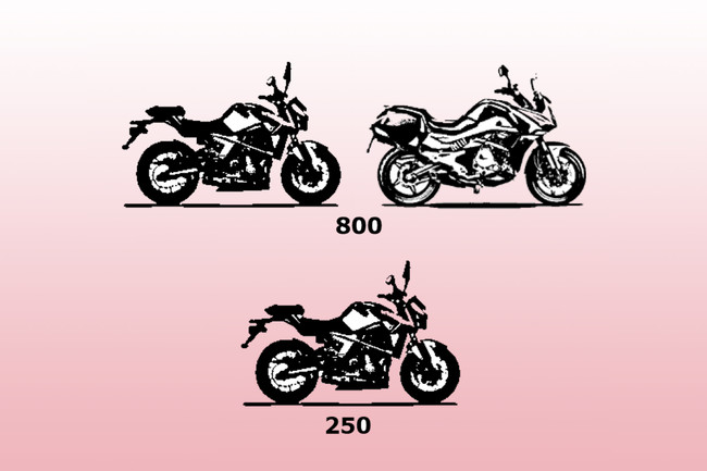 De estas tres motos, dos tendrán un motor con una cilindrada de 800 cc mientras que habrá otra más pequeña de 250 cc. Dos de ellas serán naked y la otra será de tipo touring (en el boceto se aprecian dos maletas de viaje y un carenado con cúpula).