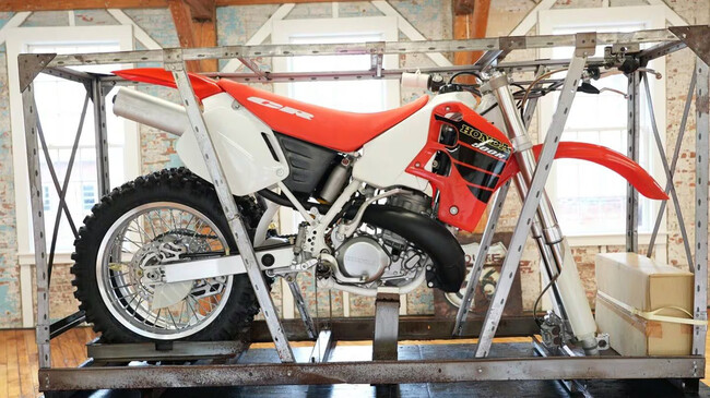 Así que es una moto con historia. Ahora la venden por un pastizal. La Honda CR 500 que se ha subastado es del año 2001, completamente original... Tan original que ni siquiera ha salido de su embalaje original; la caja con la que fue enviada desde Tokio.