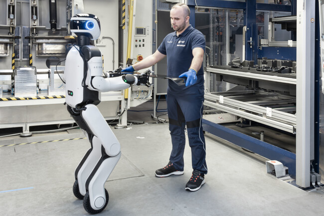 El modelo que BMW está probando en Leipzig se llama AEON y ha sido desarrollado junto a la empresa tecnológica Hexagon. Tiene proporciones humanas (brazos, torso y capacidad para manipular herramientas) aunque en lugar de piernas se mueve sobre una base con ruedas, lo que le permite desplazarse con más estabilidad dentro de la fábrica. Y su trabajo inicial se centra en áreas donde la automatización todavía tenía margen de mejora, como la fabricación de componentes o el montaje de baterías de alto voltaje.