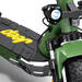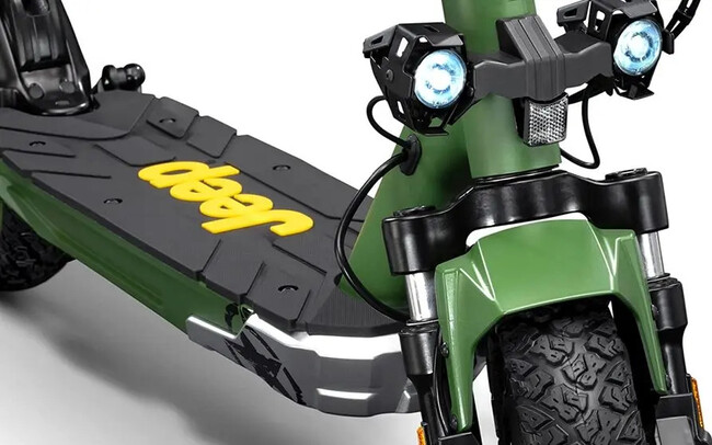 La imagen lo es todo para este patinete eléctrico, que se aleja de todo lo que habíamos visto hasta ahora. Tiene aspecto robusto, con un color verde clásico utilizado por Jeep, y calzado por unos neumáticos con banda de rodadura muy similar a la de los 4x4 que la marca tiene. En la parte frontal de la plataforma dispone de un protector de apariencia metálica.