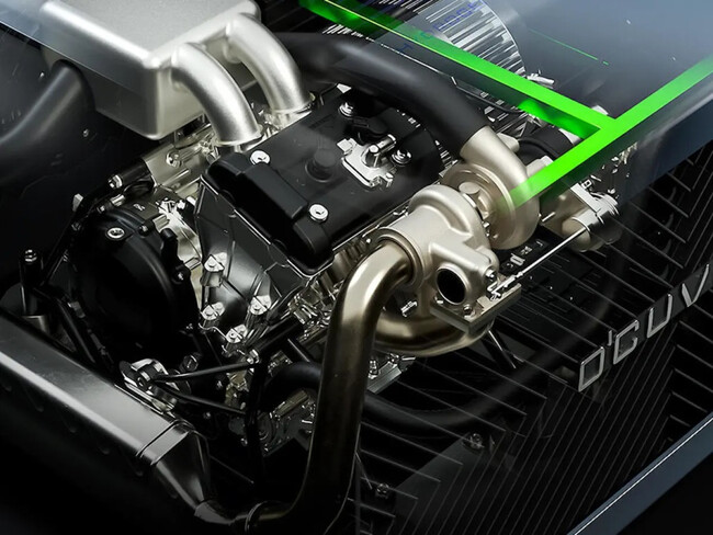 El corazón está en ese "O'CUVOID", que nace de un motor de moto. Funcioan con gas y está equipado con un sistema de presión biturbo. No solo proporciona la energía suficiente para mover la cabina de varios vehículos, sino que genera electricidad para alimentar otros sistemas.