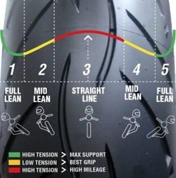 Estas cinco zonas trabajan de forma diferente en función de las necesidades que se le exijan al neumático. Así por ejemplo, en el centro prima la duración con el paso de los kilómetros mientras que en la zona que usamos a media inclinación, lo más importante es el agarre pues nos encontramos en la zona de aceleración. Por último, en máxima inclinación, primará la estabilidad y la precisión de trazada.