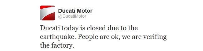 Vía | Twitter En Motorpasión Moto | Ducati podria tener que parar la producción por el terremoto