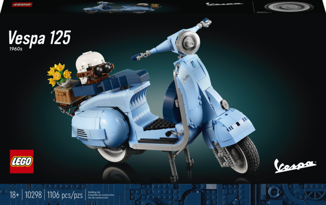 Inspirada en la Vespa clásica de la década de 1960, su tono azul pastel, un color LEGO apenas usado, espera conquistar a los fans de la construcción. Y es que su compleja arquitectura es un fiel reflejo de la realidad. Al igual que la Vespa original, está equipada con un sistema de dirección, pata de apoyo móvil, 2 asientos y motor para construir debajo de una cubierta desmontable, y cuenta con una rueda delantera montada en un lateral.