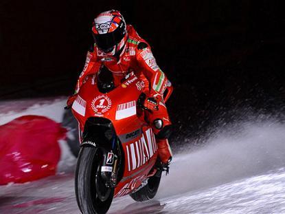 Como ya os avisamos, ayer arrancó el 'Wrooom 2008' con la presentación oficial del equipo Ducati Marlboro de MotoGP. Un año más la estación invernal de Madonna di Campiglio acoge el evento, así que el piloto probador Victoriano Guareschi aprovechó su lago helado para hacer una exhibición con la Desmosedici, que lógicamente no calzaba unos neumáticos corrientes, sino unos especiales provistos de clavos, que podéis observar en una de las fotos (por cortesía de 'Ponme un kilo de chattering') de la galería.