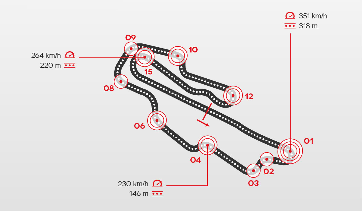 Establecido como un nivel tres sobre cinco de dificultad, en cifras brutas los pilotos de MotoGP al final de los aproximadamente 40 minutos de carrera habrán pasado frenando unos 11 minutos de manera continua acumulando más de una tonelada de presión sobre la manera derecha.