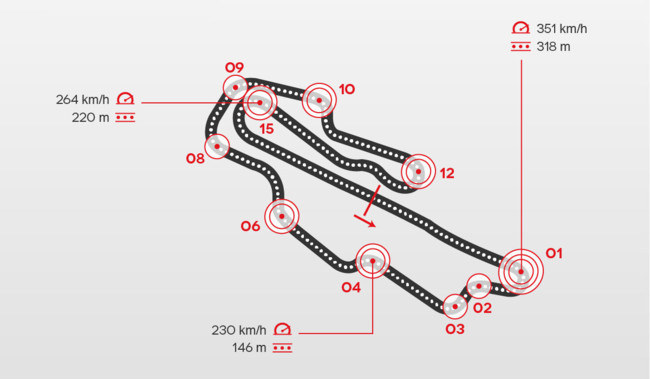 Son 10 frenadas contundentes con una media de 1,06 g de deceleración, pero de entre todas destaca la primera curva: San Donato. Las MotoGP llegan al primer ángulo incluso por encima de 350 km/h y reducen hasta sólo 91 km/h. La frenada es de infarto con cinco segundos y medio de frenada en los que se aprieta con 7 kilos de presión la palanca de freno.