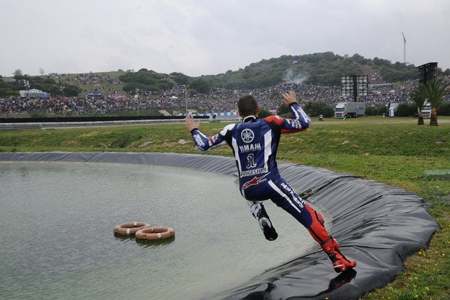 Después de la polémica con los comisarios que ayudaron más a un piloto que a otro, del adelantamiento forzado más o menos arriesgado de Valentino Rossi a Casey Stoner y de la embestida de Jules Cluzel a Marc Márquez en el mismo punto del circuito de Jerez, toca también sacar el lado positivo y divertido de nuestro Gran Premio. Y aquí hay que mencionar al ganador de la carrera y actual líder del mundial, Jorge Lorenzo, que acabó dándose un breve baño en la laguna del circuito.