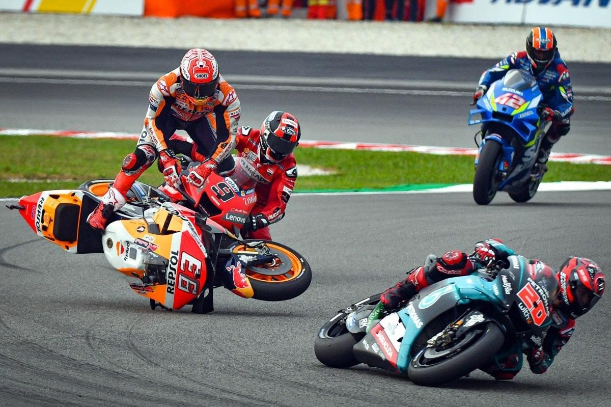 La caída no estuvo falta de polémica. Marc Márquez, que no tenía ritmo para hacer la pole en solitario, estaba persiguiendo a Fabio Quartararo por todo el circuito para hacer la vuelta rápida a su rebufo, ante la desesperación del francés. Pero en la curva 2, ya en plena vuelta lanzada, Márquez forzó demasiado y se fue al suelo, dejando la pole en manos de Quartararo.