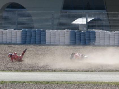 Casey Stoner, que ayer marcó el mejor tiempo en Jerez, ha sufrido una caída en la quinta curva de Jerez, una rápida a izquierdas donde Mick Doohan se cayó por última vez en su carrera deportiva (1999). Al parecer, el australiano tiene afectado el ligamento de la clavícula, y ha abandonado el circuito en ambulancia. Stoner no podrá participar en la última sesión que se celebrará mañana.