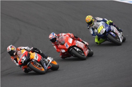 No sólo fue desconcierto pasajero, sino que a partir de ahí no supo engancharse al nuevo ritmo impuesto por Casey Stoner, y comenzó a descolgarse. Por detrás venia Jorge Lorenzo, remontando y solucionando así en cierta manera su mala salida. Cayó hasta el quinto puesto desde la pole, y tuvo que apretar los dientes. Cuando alcanzó a Dani, lo lógico era intentar pasarlo, pero claro, Dani tampoco iba a perder un podium en favor de Yamaha (ya no nos quedamos tan sólo en terreno pilotos). Al final de todo, Lorenzo lo da todo e intenta un adelantamiento manifiestamente imposible que casi tira a Pedrosa. Pero bonito, porque es un tio que lo intenta todo.