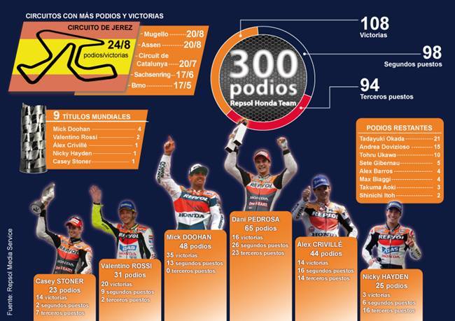 En 1995, la compañía petrolera Repsol entraba a formar parte como patrocinador principal del equipo Honda, conformándose el Repsol Honda Team que actualmente conocemos. 18 años después y gracias a la victoria conseguida por Casey Stoner y el tercer puesto de Dani Pedrosa en el Gran Premio de Estados Unidos celebrado ayer, llegan a la cifra de 300 podios.