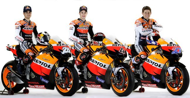 Hace unas horas nos llegaban a través de Twitter las primeras imágenes de Casey Stoner con los colores de gala de Repsol. Pues bien, poco después daba comienzo en Sepang la presentación del Repsol Honda Team al completo; desde Casey a Dani Pedrosa pasando por Andrea Dovizioso. A imagen y semejanza de Michael Doohan, Álex Crivillé y Shinichi Ito los pilotos de HRC encaran una nueva temporada recordando los tiempos de gloria en los que también eran tres los que corrían bajo el logo de Repsol.