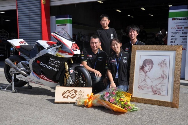 Fred Corminboeuf, jefe del equipo junto al CEO de Dorna; Carmelo Ezpeleta, CEO de Dorna; Dominique Aegerter y Tomoyoshi Koyama, actuales pilotos del Technomag-CIP y Alain Bronec, dueño del equipo, tomaron parte en esta bonita forma de recordar al sonriente Shoya. El expiloto Noboru Ueda fue el encargado de recibir y ensamblar la moto en Japón que recibió unas semanas antes. Su papel para ayudar a sobrellevar la muerte de Shoya Tomizawa a sus amigos y familiares fue muy importante durante los meses siguientes a su terrible accidente.