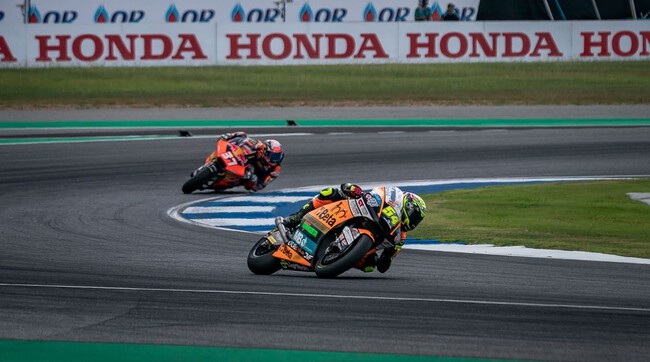 Con 18 años, este piloto murciano está en su mejor momento desde que corre en Moto2. Ganó el pasado fin de semana en Tailandia su segunda carrera, después de haberlo hecho también en Silverstone, y eso que corre con una Boscoscuro que teóricamente está por detrás de las Kalex campeonas.