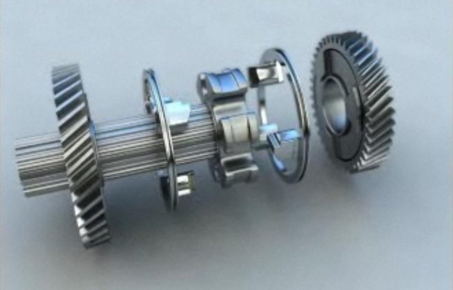 En la animación se encuentra representada una caja de cambios muy sencilla, con tan sólo dos velocidades. La primera velocidad se encuentra a la izquierda y la segunda a la derecha. Lo primero que vemos es el acoplamiento con el eje de salida, que se produce cuando el anillo situado a la derecha se mueve hacia la izquierda. A continuación, se engrana la primera velocidad. Para ello, el anillo situado a la izquierda se mueve hacia ese mismo lado, acoplándo el piñón de la primera velocidad.
