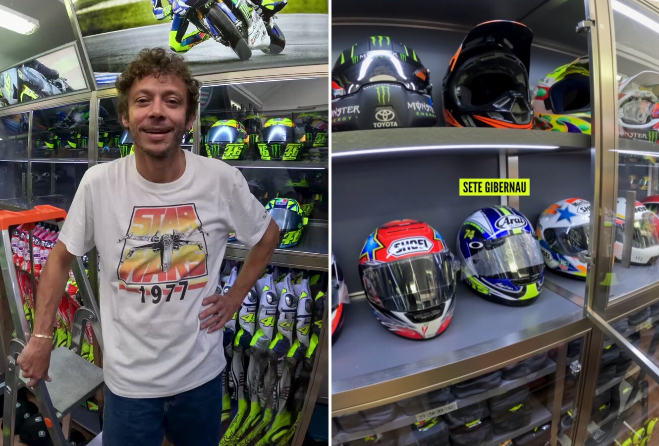 GoPro en mano, Rossi nos enseña con cercanía cada una de las vitrinas de cristal donde guarda como si fuesen trofeos, cada uno de los cascos de rivales con los que ha competido. Y todos están en un estado impecable, además de muchos de ellos, firmados.