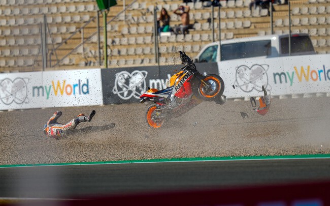 El piloto que más se ha caído en MotoGP 2021 ha sido Marc Márquez, y eso que ha disputado cuatro Grandes Premios menos. En total son 22 las veces que Márquez se ha arrastrado por el asfalto, por las 20 de Espargaró, las 19 de Álex Márquez, las doce de Nakagami y las dos que ha tenido Bradl en sus sustituciones y 'wild card'.