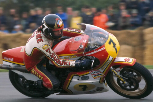 Barry Sheene ganó el título en 1976 y repitió en 1977. La RG500 era la referencia total: ligera, potente y ahora también eficaz.