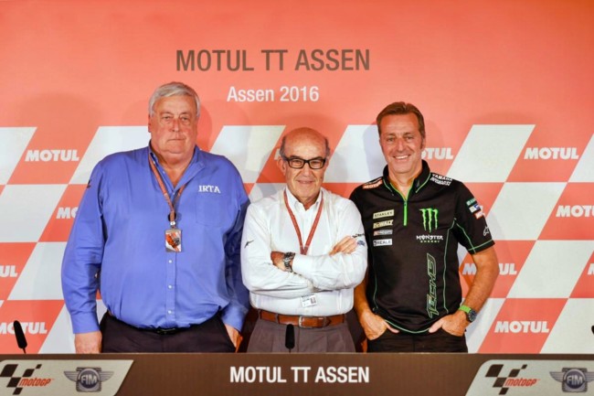 Durante los preparativos del Gran Premio de Holanda que se va a celebrar este fin de semana en Assen, IRTA (International Road-Racing Teams Association) y Dorna han anunciado que su acuerdo se renueva una vez más y les mantendrá unidos otros cinco años. La comparecencia ha corrido a cargo de Carmelo Ezpeleta (Dorna), Herve Poncharal (presidente de IRTA) y Mike Trimby (CEO de IRTA).
