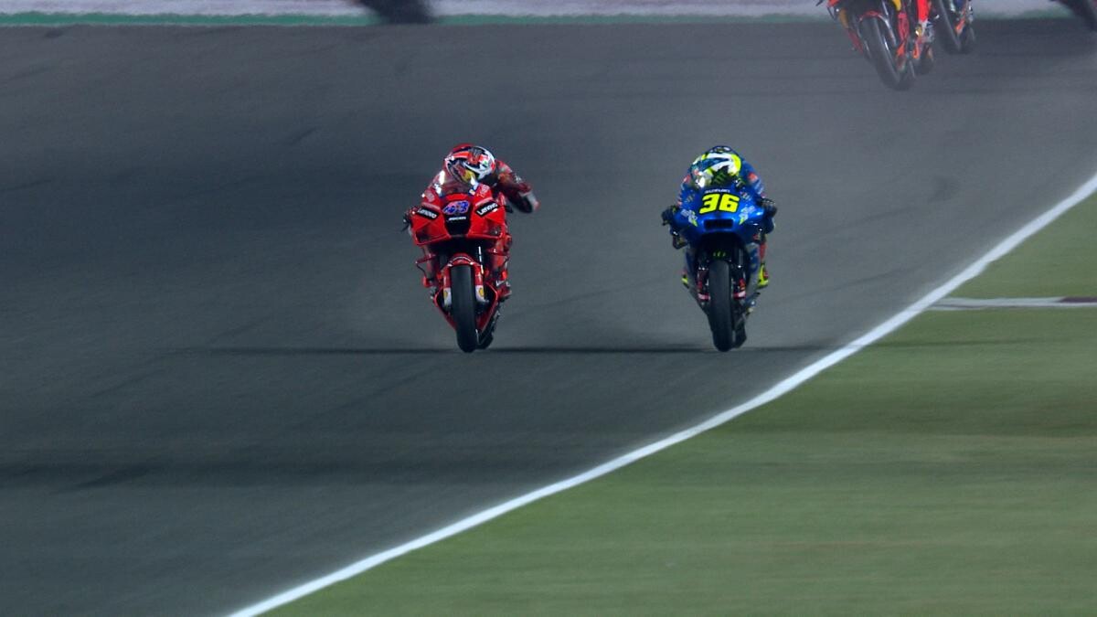 Todo ocurrió a diez vuelta del final. Las Suzuki y las Yamaha tenían un déficit de potencia tremendo en Losail, así que solo podían adelantar en la zona revirada y arriesgando mucho. Así lo intentó hacer Mir, pero el campeón tocó a Miller en una acción que, siendo justos, fue bastante al límite. Pero no justifica la reacción de Miller.