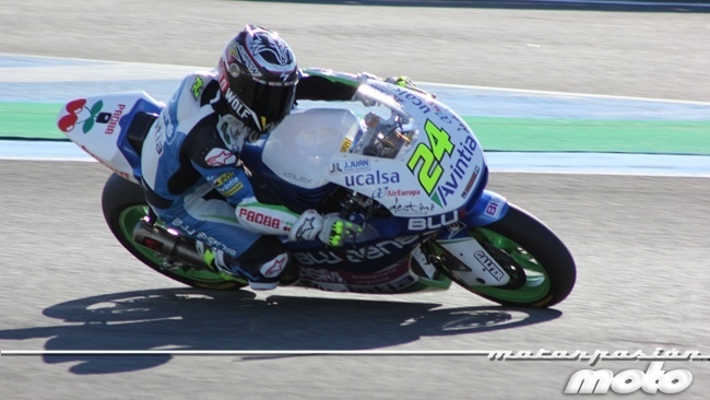 La categoría pequeña del campeonato y grande en emociones era la que abría la mañana con una hora en solitario, para después compartir pista con Moto2 en las dos últimas horas. Pues bien, combinando las dos sesiones el más rápido ha sido el alemán Jonas Folger, del Team Aspar, quien ya demostró a finales del año pasado que con una máquina decente es capaz de hacer grandes cosas. La verdad es que viéndole en pista no extraña para nada que sea el más rápido, y es que aquí el amigo va subiéndose por las paredes en todo momento. Sin duda, es uno de esos pilotos muy espectaculares pilotando, y encima efectivo. El caso es que ha parado el crono en 1:47.149, si bien es cierto que no ha batido los registros marcados por Maverick en el pasado test de hace un mes, aunque sí los suyos.