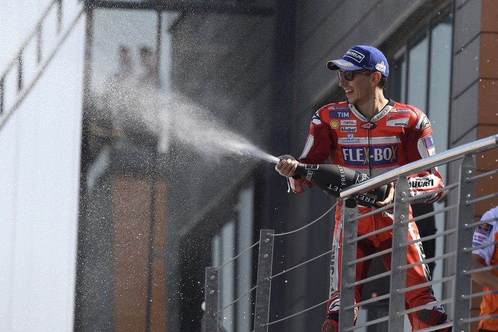 Los del Ducati Team tenían claro desde un principio que no iban a poder mantener el ritmo durante las últimas vueltas de la carrera, pero tampoco tenían más opciones que usar el neumático blando para ser competitivos. La goma de Jorge dijo basta a falta de siete vueltas, donde Márquez y Pedrosa tomaron la cabeza: “Sabíamos que al final el rendimiento de la goma trasera bajaría. Había mucha diferencia entre la goma blanda y la media traseras, al final hemos sufrido mucho. Dani y Marc tenían un buen ritmo al final de la carrera”.