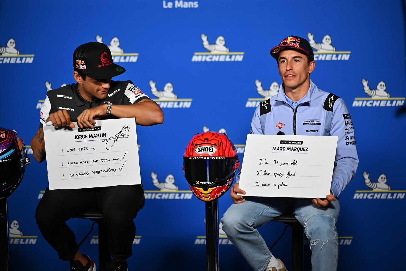 Curiosamente, en su turno Márquez propuso como opción que "tengo un plan", y al ser preguntado, Bagnaia aseguró que esa era la mentira. Sin embargo, Márquez reveló que era que "no me gusta la comida picante". Las indirectas vuelan en todas las direcciones dentro del entramado de Ducati en MotoGP.