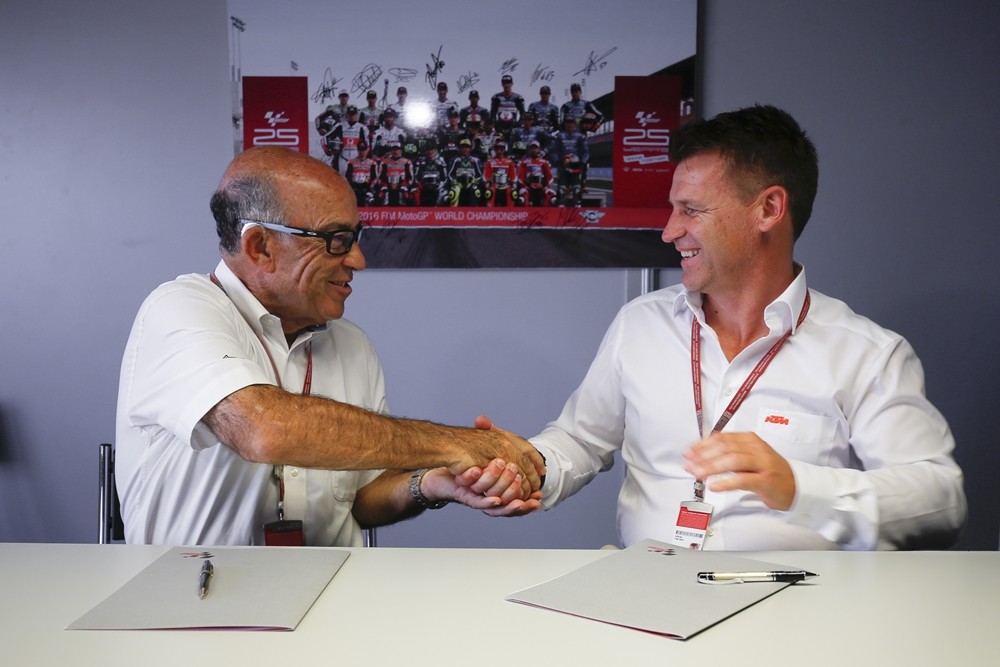 Aprovechando la disputa del Gran Premio de San Marino y la ribera del Rimini, Carmelo Ezpeleta (CEO de Dorna Sports) y Pit Beirer (director de KTM) firmaron el susodicho acuerdo, que también ha sido enviado a los otros cinco fabricantes presentes en MotoGP. Esto ratifica la llegada de KTM con la RC16, que se complementará con su irrupción en Moto2 con la WP KTM.