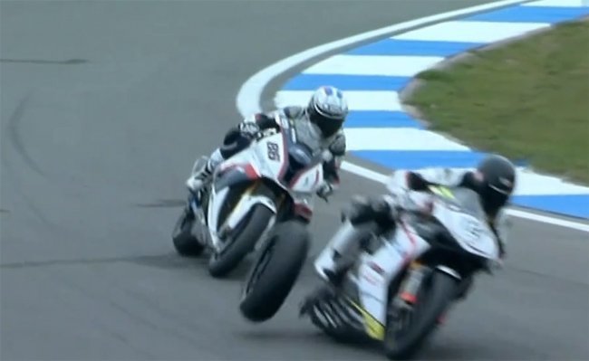 Estoy seguro de que esta os ha recordado a otra muy parecida pero que tuvo lugar en la primera curva del circuito de Jerez en 2008. Lleva el cinco en el carenado y la bandera de los Estados Unidos tiene siempre un hueco en el diseño de su casco. Estoy hablando, cómo no, de Colin Edwards. Lo que la grada pudo ver entonces pocas veces se repite y por ello Colin se encargó de dejarlo claro con sus gestos.