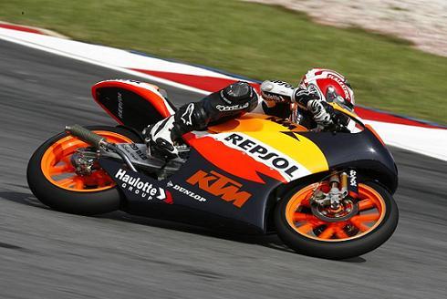 La pole provisional de Andrea Iannone en los entrenamientos libres de 125cc del GP de Malasia, se ha quedado en anécdota después del enorme susto que nos ha dado el jovencísimo piloto Marc Márquez. El piloto de KTM se fue al suelo en los instantes finales de la primera sesión al ser tocado por detrás por Cyril Carrillo, con la poca fortuna de que su pierna izquierda se quedara atrapada entre el basculante y la rueda trasera. La rápida reacción de los mecánicos, desmontando la rueda y desinflándola para liberar a Marc, ha sido determinante.