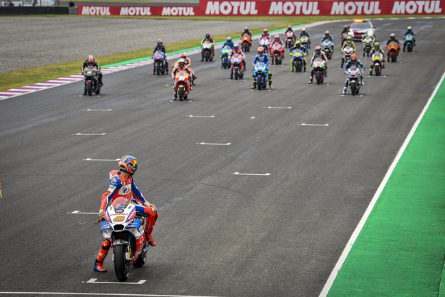 Con todos los pilotos en la parrilla, todos los equipos han decidido empujar sus motos hasta el pit lane para poder cambiar de moto y salir con la configuración de seco, más allá de los neumáticos. El único que ha permanecido en su posición ha sido Jack Miller, forzando un retraso en la salida por cuestiones de seguridad.