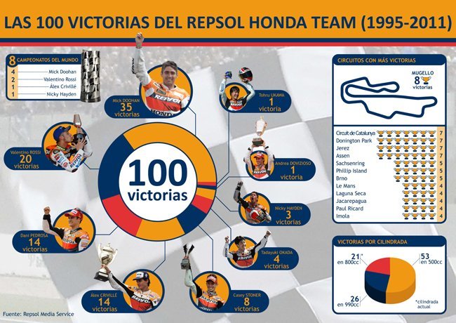 Después de la victoria de Casey Stoner en Aragón el equipo Repsol ha alcanzado al fin la cifra de 100 victorias en la categoría reina. Una cifra que muy pocos podrán alcanzar a lo largo de la historia. Desde su entrada en el Mundial de GP500 en 1995 Honda y la petrolera española han continuado sin pausa un proyecto repleto de éxitos en los que han conseguido nada más y nada menos que ocho títulos en la máxima categoría del motociclismo mundial. Por sus filas han pasado muchos de los mejores pilotos que podemos recordar y, para no variar, hoy en día cuenta con los favoritos para hacerse con el campeonato de 2011.