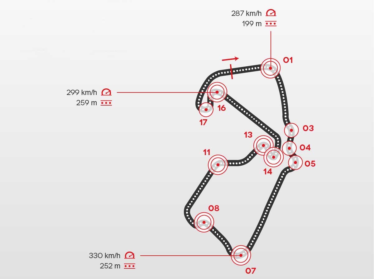 El resto de las curvas son siete de dificultad media y cuatro suaves, pero no te pienses que los pilotos van tranquilos en esas zonas del circuito o que vamos a ver menos adelantamientos.