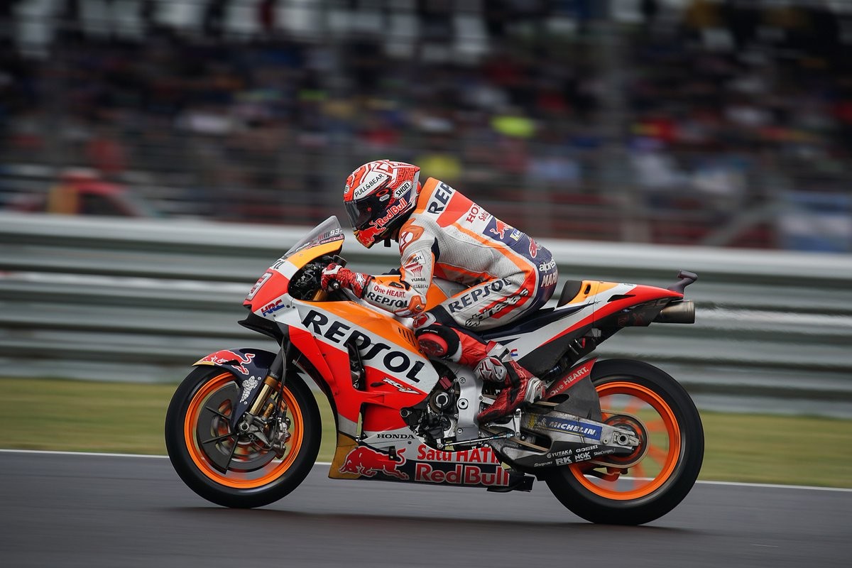Marc Márquez ha sido el más rápido en la FP2 de MotoGP esta tarde. El piloto del Repsol Honda, uno de los que menos vueltas ha completado, ha marcado un crono de 1:33'995 que nada tiene que ver con los tiempos que pudieron marcar en la primera sesión, cuando las condiciones de la pista eran más favorables.