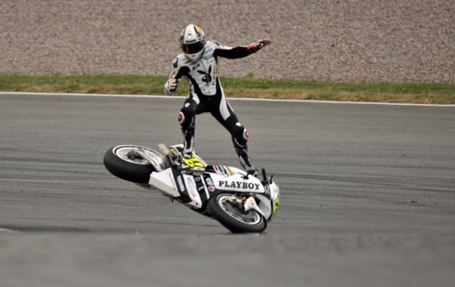 En cuanto al GP de Alemania, y para terminar (que ya os estaré aburriendo), decir que ha sido un fin de semana para olvidar. El sábado caía después de pisar el aceite que había dejado en pista Lorenzo y se llevaba un fuerte golpe en su tobillo ya maltrecho anteriormente, además de una pequeña fisura en la tibia. Pero todavía le quedaba algo peor para el domingo, y es que se fue al suelo junto con Aleix Esparagaró y Álvaro Bautista, acabando con una rotura de tibia y peroné (¿a qué se ha llevado menos titulares que Rossi?), lo que le mantendrá un tiempecito alejado de los circuitos, sin duda una auténtica lástima. Ayer le operaron y todo salió perfecto, ya sólo queda esperar una buena y pronta recuperación. Por supuesto, él opina también que ha sido un auténtico desastre de fin de semana y comentaba después de la caída: