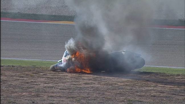 Barberá se apresuró a apartarse de la pista, lanzándose de la moto tan pronto como pudo sentir las llamas. Por lo que vemos, el campo visual del casco cubría las llamas y Héctor no se dio cuenta de la gravedad del asunto hasta sentir el calor traspasando las zonas de flexión del mono Alpinestars. Dorna ha tenido la gentileza de publicar el vídeo en la web de forma gratuita.