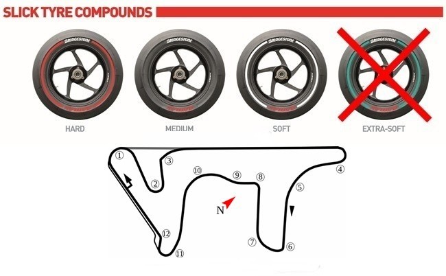 Debido a esta característica tan exigente con las ruedas, se ha optado por los compuestos más duros de la gama de Bridgestone, es decir, para las motos Factory el duro y el medio mientras que las Open y Ducati contarán además con la opción del neumático blando.