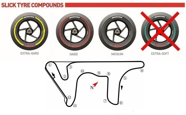 Los compuestos disponibles para las motos de la categoría Factory como son Honda y Yamaha, serán neumáticos traseros en especificaciones duro (asimétrico) y extra-duro mientras que las Open, Ducati, Suzuki y Aprilia tendrán a su disposición medio y duro (asimétrico). Delante se utilizarán tres especificaciones con el fin de adaptarse a todas las condiciones: duro, medio y blando.