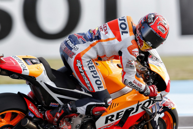 Vayamos primero con lo que nos concierne. Marc Márquez se ha hecho esta tarde con su 59ª pole position habiendo dando única y exclusivamente dos giros durante la QP2, al estilo Stoner. Valentino Rossi, al contrario, se sacó su mejor vuelta al final de la sesión para colocarse segundo ya con la bandera a cuadros ondeando. Y sí, Jorge Lorenzo completa una primera línea de lujo para una complicada carrera.