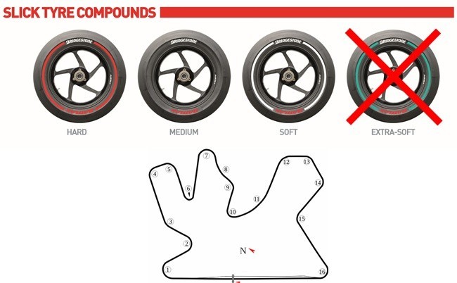El circuito cuenta con diez curvas a la derecha y seis a la izquierda, obligando por lo tanto a usar neumáticos traseros asimétricos con un compuesto más duro en el flanco derecho. Los compuestos disponibles para las motos de la categoría Factory como son Honda y Yamaha, serán neumáticos traseros en especificaciones medio y duro mientras que las Open, Ducati, Suzuki y Aprilia tendrán a su disposición blando y medio. Delante los compuestos elegidos son el medio y el duro. Debido a los reflejos por la luz artificial no se puede correr en condiciones de mojado por lo que no hay asignación de neumáticos de lluvia.