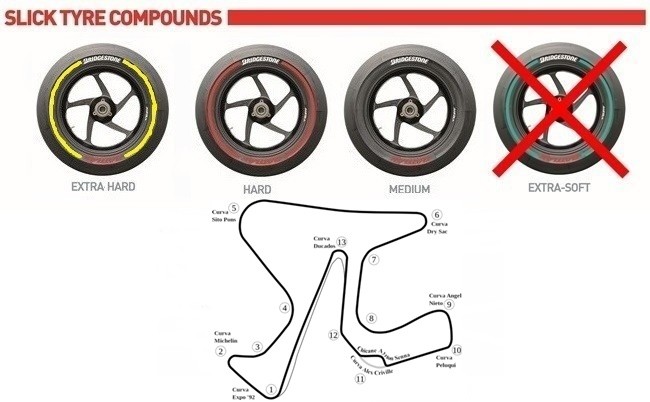 Los compuestos disponibles para las motos de la categoría Factory como son Honda y Yamaha, serán neumáticos traseros en especificaciones medio y duro (asimétricos) mientras que las Open, Ducati, Suzuki y Aprilia tendrán a su disposición blando y el medio asimétrico. Delante se utilizarán tres especificaciones con el fin de adaptarse a todas las condiciones: duro, medio y blando.