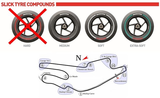 Le Mans tiene un diseño de stop-and-go y, en general, las cargas laterales que sufren los neumáticos en Le Mans son bajas en comparación con otros circuitos. Además, el asfalto es suave y bajo en su agarre. Por lo tanto, el Gran Premio de Francia es la primera ocasión en este año en que vamos a ofrecer las opciones extra-blanda delante y detrás. El trazado del circuito significa que los pilotos quieren neumáticos con un buen agarre trasero para la aceleración de las curvas, y la estabilidad óptima del neumático delantero para las muchas zonas de frenada. Aunque el circuito en general es bastante benévolo con los neumáticos, el flanco derecho del neumático trasero sufren más estrés que el izquierdo, sobre todo en la salida de la curva 9. Como resultado, todos nuestros slicks traseros asimétricos para Le Mans cuentan con un compuesto más duro de goma en el flanco derecho.